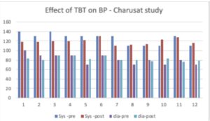The effect of TBT on Blood Pressure was studied during a clinical trial at Charusat University, Gujarat India. 30 participants (15 male, 15 female) between the ages of 40 and 55 with no co-morbidities were administered TBT 4 times a day for 15 days, with each session lasting 10 minutes.